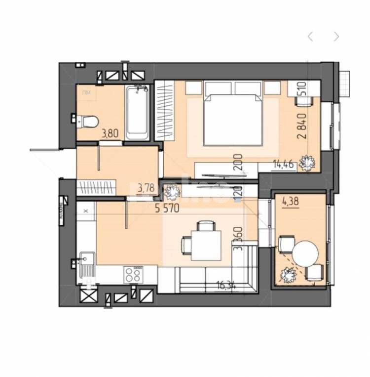 Площа 41 м2 ( кухня 16м2,спальня 14,5 м2,санвузол 4м2,балкон 4м2 )
